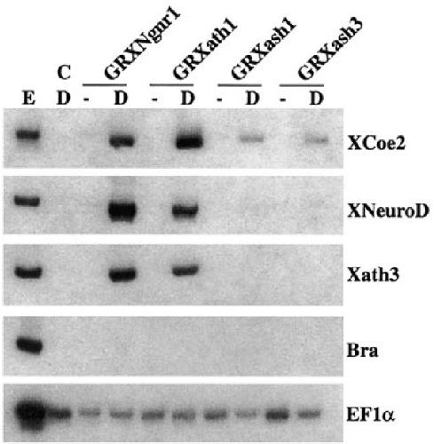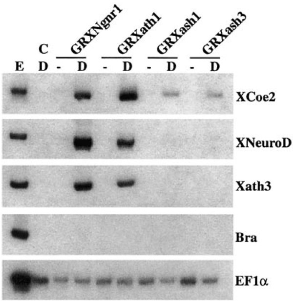 in GRXash1- and GRXNgnr1-injected animal cap samples incubated for 20 h with (D) or without ( ) Dex. Embryo (E) and uninjected animal