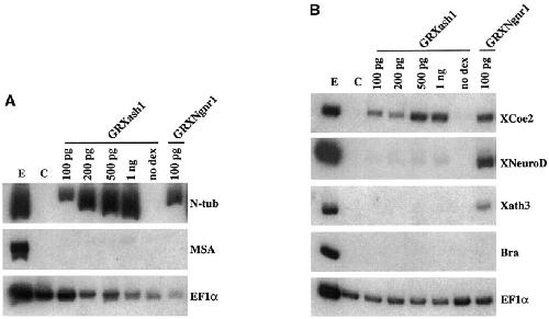 GRNBX, GRNHX; C: GRNH1X) as well as the wild type Xash1 and XNgnr1 genes were analyzed in animal cap assays as described in the