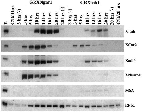 FIG. 4. Time course of GRXash1 and GRXNgnr1 function. PCR analyses were used to analyze gene expression at successive time points