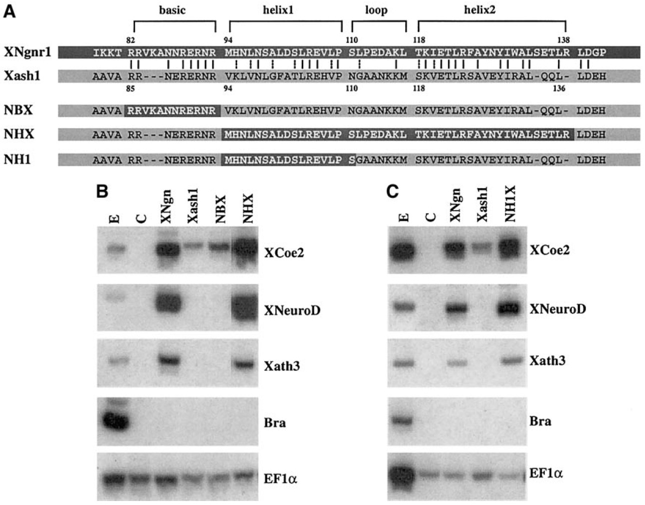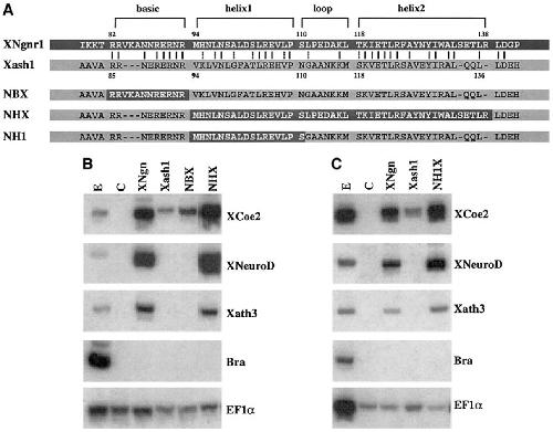 and XNgnr1 protein coding sequences. In NHX, the HLH domain of XNgnr1 specifically replaces Xash1 HLH domain. In NBX, the basic