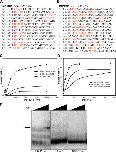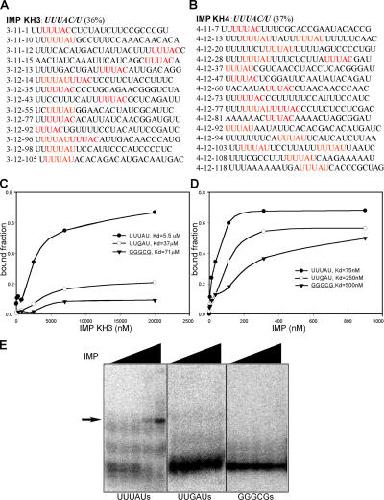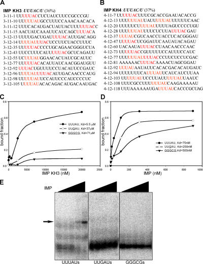 Figure 2. Characterization of the IBE UUUAY. (A and B) Representative RNA sequences selected after 12 rounds of SELEX against IMP's KH3 (A) and KH4 (B) domains. IBEs are in red. (C and D) Filter-binding assays between three tandem repeats of the winner sequence 4-12-13 (or the same RNA with IBEs mutated to UUgAU or gggcg) and either IMP KH3 (C) or the entire protein (D). (E) Electrophoretic mobility shift assay between IMP and three tandem copies of the winner sequence 4-12-13 containing either WT or mutant IBE motifs. Only RNAs with the WT (UUUAU) motifs induced a band shift.