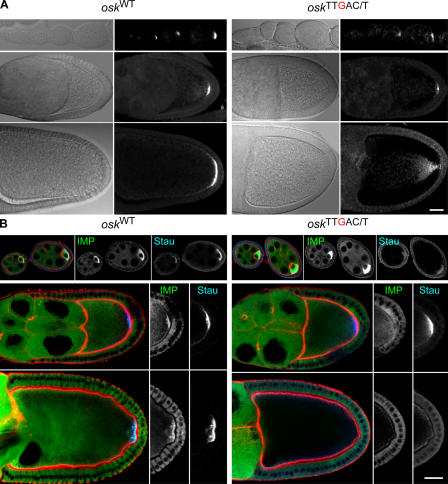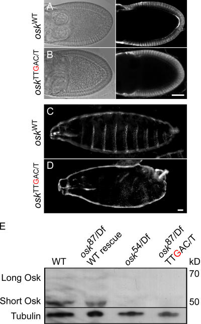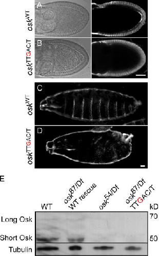 Figure 5. IBE mutations abolish osk RNA translational activation. (A and B) Anti-Osk immunostaining of osk87/Df(3R)pXT103 egg chambers expressing a WT osk transgene, showing a crescent of Osk protein (A). Osk protein is missing in egg chambers from oskTTgAY flies (B). (C and D) Cuticle preparations of larvae from osk87/Df(3R)pXT103 that express the WT (C) or mutant oskTTgAY (D) transgene. (E) Western blot of ovarian protein extracts probed with anti-Osk antibody, followed by an anti-tubulin antibody. Extracts were from WT flies with no osk transgene (WT) or from osk87/Df(3R)pXT103 flies expressing either a WT or the IBE mutant oskTTgAY osk transgene, or the nonsense mutant osk54 transgene. Neither long nor short Osk is present in the oskTTgAY or osk54 mutants. Bars, 25 μm.
