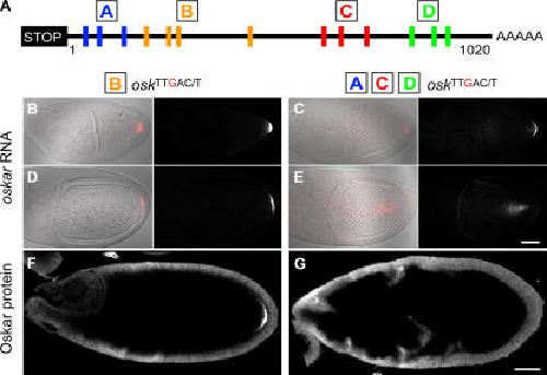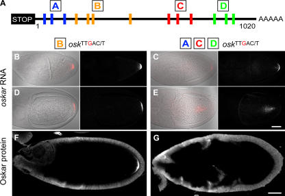 Figure 6. Mutations to nonoverlapping subsets of osk's IBEs and their affects on osk RNA and protein distributions in the oocyte. (A) Four subsets of IBEs in the osk 3′UTR: A, B, C, and D. (B–E) osk in situ hybridizations at stages 9 (B and C) and 10 (D and E). (F and G) Osk protein detected by immunofluorescence at stage 10. Oocytes that express osk RNA with mutations to IBE subset B display normal localization of osk mRNA and protein. Mutations to subset D, or to subsets A and C (not depicted) cause osk RNA delocalization from the posterior pole at stage 10; Osk protein is absent in these oocytes. Bars, 25 μm.