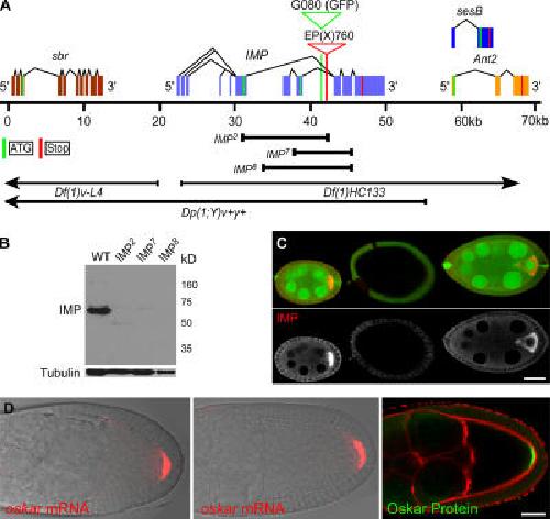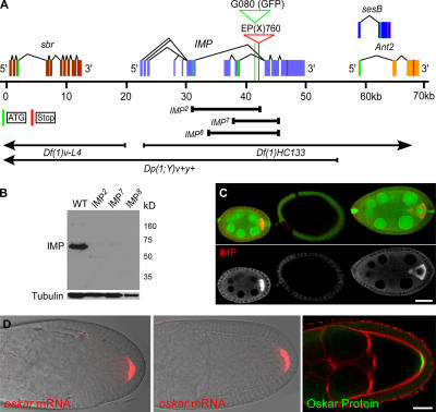Figure 7. Analysis of oocytes that lack IMP protein. (A) The imp gene is flanked by sesB, Ant2, and sbr. Diagram shows alternatively spliced isoforms (exons in blue), the location of GFP in protein trap line G080, and P element insertion EP(X)760 used to create three mutant alleles of IMP. The positions of the two alternate ATGs are shown in green. (B) Immunoblots of preblastoderm embryos laid by mothers with IMP mutant germline clones. IMP2 may produce a truncated protein, whereas IMP7 and IMP8 are protein nulls. (C, top) A germline clone (center egg chamber) marked by the absence of GFP. (bottom) IMP is absent only from the mutant clone. (D) The distributions of osk mRNA and Osk protein in IMP-null egg chambers (middle and right) are indistinguishable from WT (left) in IMP mutant germline clones generated using the FLP/FRT OvoD1 DFS technique. Bars, 25 μm.