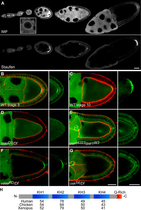 Figure 1. IMP localization during oogenesis. (A–G) Localization of IMP during oogenesis visualized using G080, a GFP protein trap line (A, B, and E–G), or a GFP–IMP fusion construct specifically expressed in the germline (C and D). (A) IMP localizes to future oocyte in the germarium, accumulates in the oocyte through stage 7–8, appears enriched at both the anterior and posterior of the oocyte at stage 8, and is restricted to a crescent at the oocyte posterior pole by stage 9–10. These localizations are similar to those of Staufen protein, which marks the localization of osk mRNA. Within nurse cells, IMP is primarily cytoplasmic, but also rims the nucleus (inset). (B–G) IMP localization (green) and actin (red) in oocytes at stage 9 (B) or 10 (C) in WT and mutant backgrounds (D–G). (D) IMP is absent from the posterior crescent in a stau-null mutant that fails to localize osk RNA. (E) Like osk RNA (not depicted), IMP localizes ectopically in a transheterozygous par-1 allele combination that disrupts the polarity of the egg chamber. (F) IMP localizes normally in a vasa mutant that interferes with pole plasm formation. (G) IMP localizes to the posterior at stage 9 in an osk nonsense mutant (osk54/Df(3R)pXT103) egg chamber, indicating its localization depends on osk RNA, not protein. (H) IMP contains four KH-type RNA-binding domains and a glutamine-rich COOH terminus. Numbers indicate the percentage of amino acid identity between IMP's KH domains and those of its homologues. Bars, 25 μm.