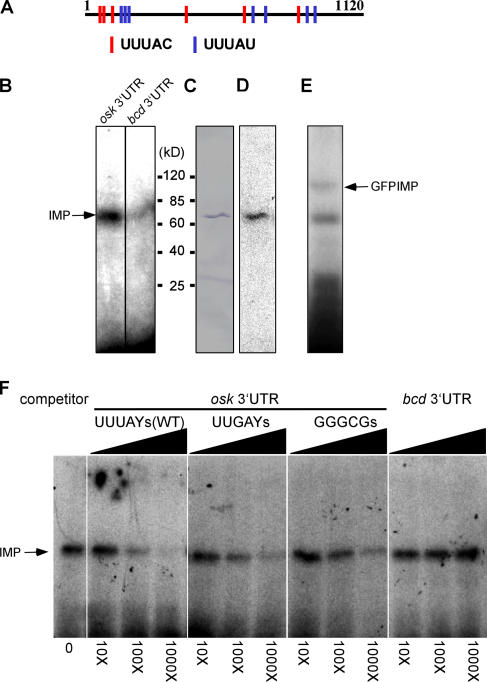 Figure 3. The osk 3′UTR contains 13 IBEs and UV cross-links to IMP. (A) Positions of the 13 IBEs in the osk 3′UTR. (B) A 65-kD protein (IMP) in D. melanogaster ovary extracts specifically cross-links the 1,120-nt osk 3′UTR, but not the 817-nt bcd 3′UTR, which contains only two UUUAY motifs. (C and D) Anti-IMP immunoblot of ovary extract (C) labels the same band that UV cross-links to the 32P-osk 3′UTR (D). (E) 32P-osk 3′UTR cross-links to an ∼95-kD polypeptide (GFP–IMP) in embryo extracts of the protein trap line G080. (F) Cross-linking reactions between the 32P-osk 3′UTR and oocyte extracts in the presence of increasing concentrations of cold, competitor RNAs, including WT and mutant osk 3′UTRs and the bicoid 3′UTR.