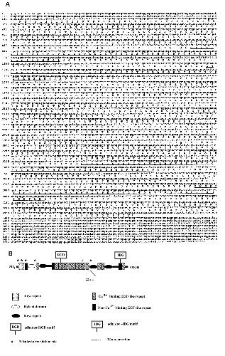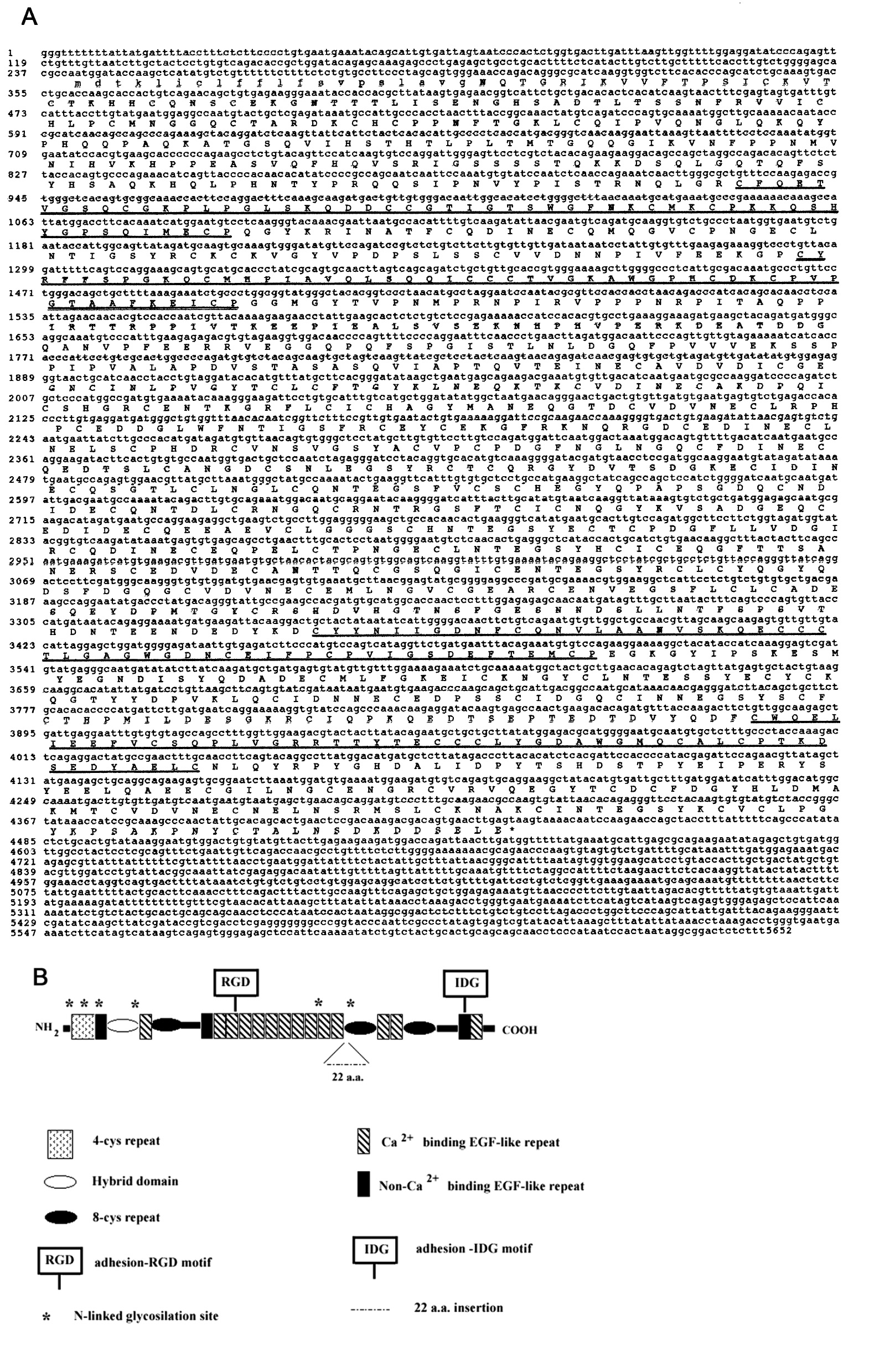 Nucleotide and predicted amino acid sequences derived from Xenopus LTBP-1 cDNA. (A) The putative signal sequence at the NH2-terminus is in lower case letters. Potential N-linked glycosylation sites are in bold. The eight-cysteine repeats are underlined. The XLTBP-1 EMBL Accession number is AJ421626. The stop codon is indicated by an asterisk. (B) Schematic representation of the XLTBP-1 protein structure.