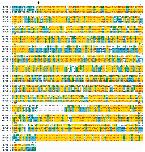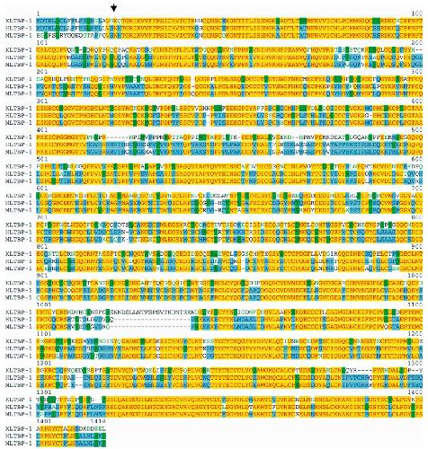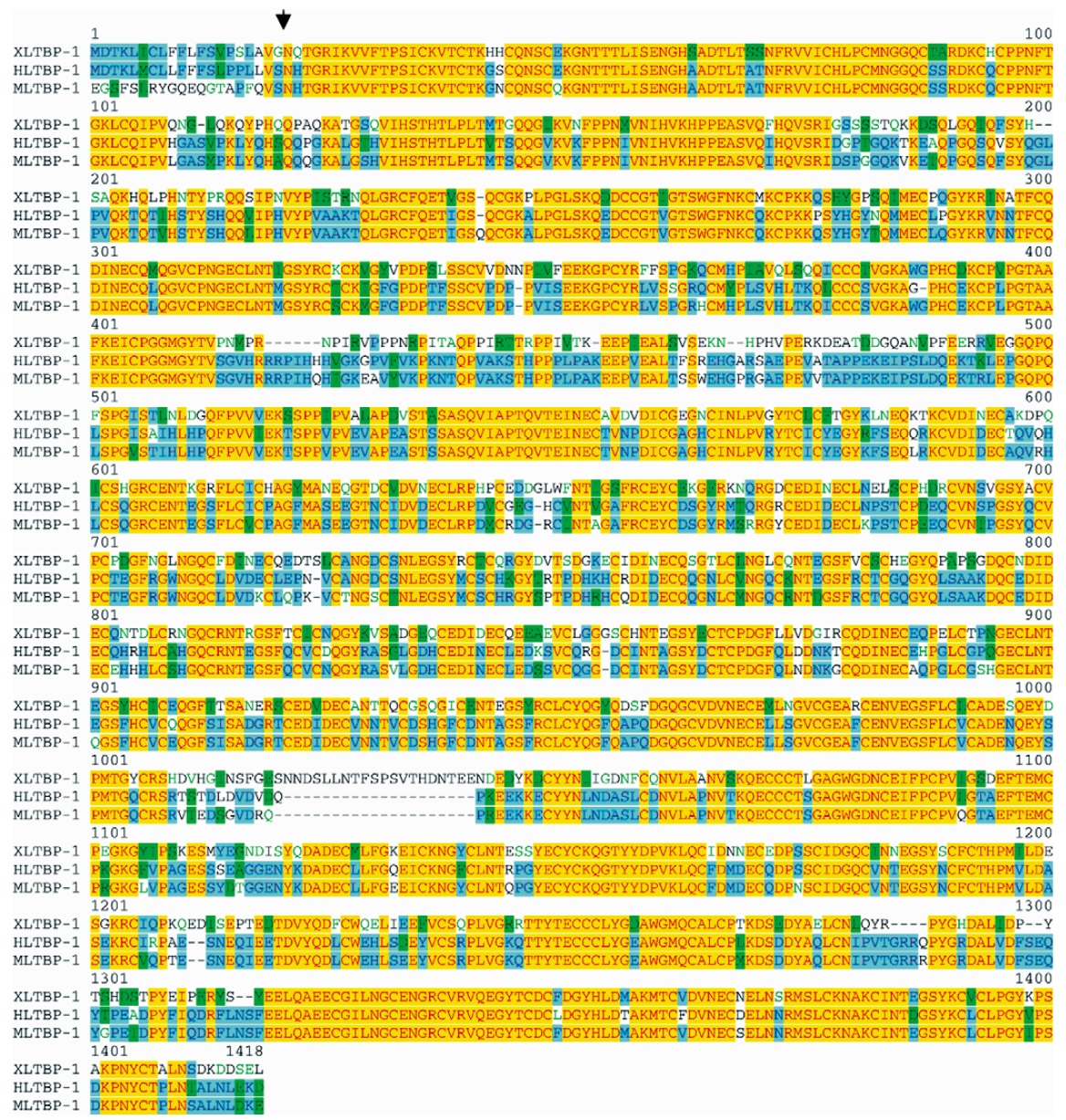 Comparison between the Xenopus, mouse and human LTBP-1 protein. The protein sequences were aligned using the pileup GCG 9.0 program. Identical residues between Xenopus, mouse and human XLTBP-1 are in yellow, non-conserved residues are in green and conserved residues between mouse and human are in blue. The human LTBP-1 Accession number is NM000627 (Kanzaki et al., 1990); the mouse LTBP-1 Accession number is AF022889 (Noguera et al., GenBank).
