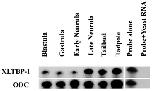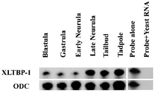 Temporal expression of XLTBP-1 during embryo development. Total RNA (20 μg) from embryos at different stages was analyzed by RNase protection assay for the presence of XLTBP-1 mRNA. The probe alone without RNase is a positive control, while the probe plus yeast RNA digested with RNase is a negative control. ODC, a constantly expressed message, was used as a loading control.