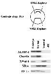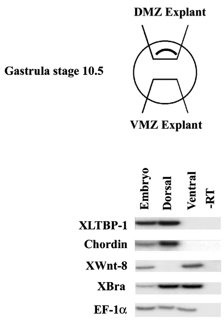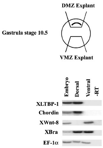 XLTBP-1 transcript localizes in the DMZ of gastrulaembryo. DMZ and VMZ were dissected from gastrula embryos at stage 10.5 and analyzed by RT-PCR for the expression of XLTBP-1. Chordin and XWnt-8 were used as dorsal and ventralmesoderm markers to ensure the accuracy of dissections, Xbra is a pan-mesodermal marker and EF1-α 1 is a loading control.