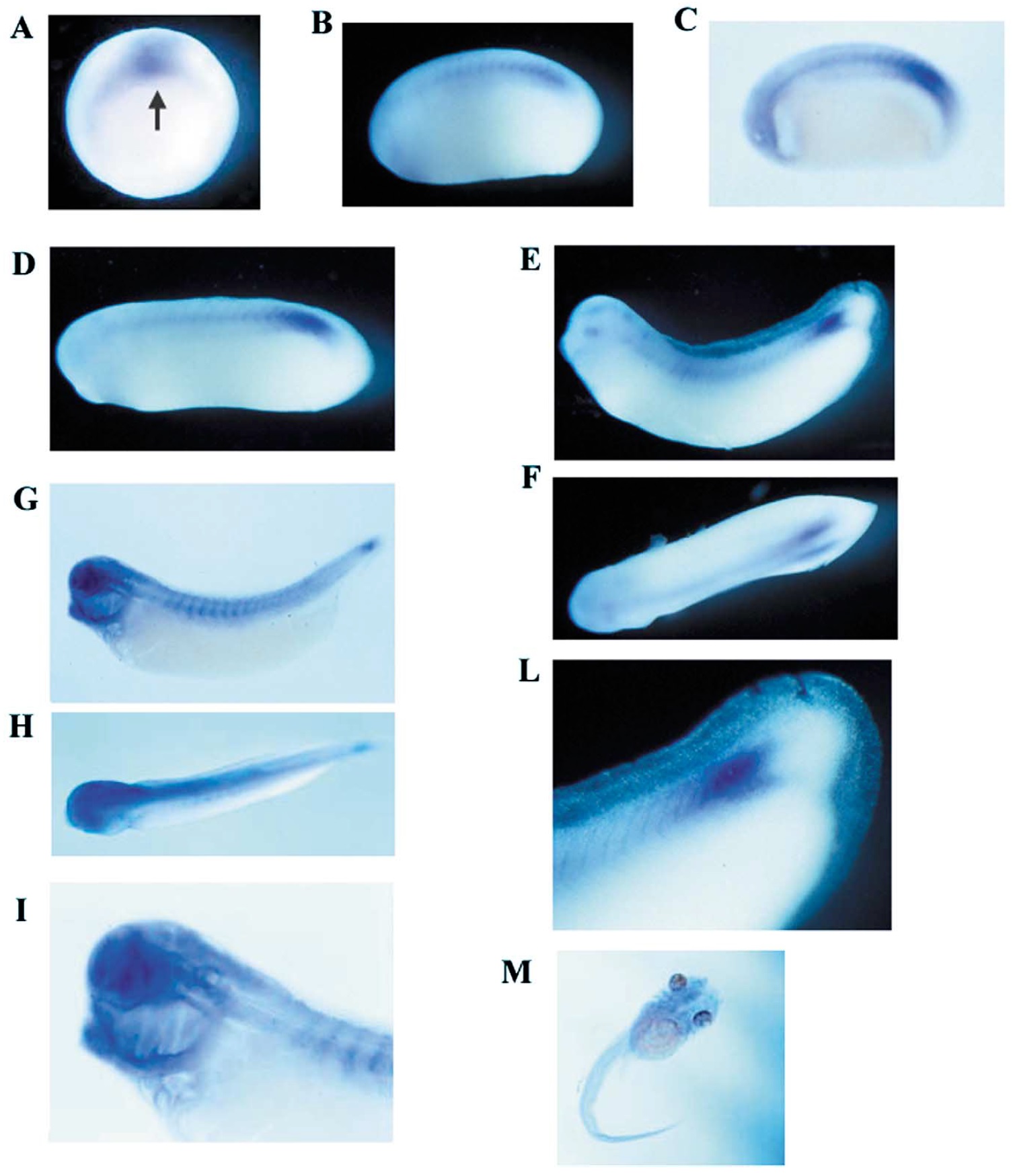 Spatial expression pattern of XLTBP-1. Whole-mount in situ hybridization on albino embryos at different stages: (A) gastrula (stage 10.5), the arrow indicates the dorsal blastopore lip; (B) mid-neurula (stage 18); (C) late neurula (stage 21); (D) early tailbud; (E) late tailbud; (F) dorsal view; (L) enlargement of (E); (BâE) lateral view with anterior end to the left; (G) swimming tadpole stage, lateral view with anterior end to the left; (H) dorsal view; (I) enlargement of (G); (M) embryo stage 55. Embryos were cleared in 2:1 benzyl-benzoate/benzyl alcohol to visualize deep staining.
