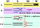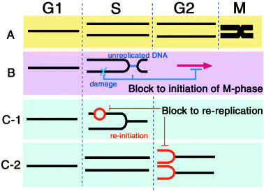 Cell cycle controls ensure genome integrity. (A) In a normal cell cycle, chromosomal DNA is replicated once before the cells enter into M phase. (B, C) Checkpoint controls ensure the temporal order of S-phase and M-phase. In the presence of unreplicated or damaged DNA, checkpoint control prevents the initiation of mitosis until the chromosomal DNA is completely replicated or the damage is repaired (B). The block to re-replication prevents a re-initiation of replication before completion of the M-phase (C). Re-replication may happen within the same S phase (C-1) or from G2, after completion of one round of replication (C-2).