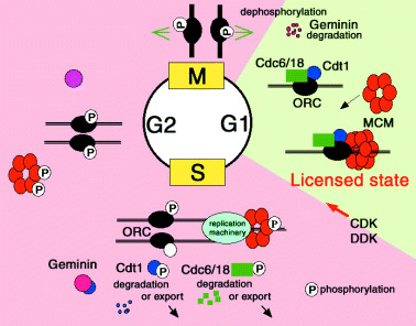 To maintain genome integrity in eukaryotes, DNA must be duplicated precisely once before cell division occurs. A process called replication licensing ensures that chromosomes are replicated only once per cell cycle. Its control has been uncovered by the discovery of the CDKs (cyclin dependent kinases) as master regulators of the cell cycle and the initiator proteins of DNA replication, such as the Origin Recognition Complex (ORC), Cdc6/18, Cdt1 and the MCM complex. At the end of mitosis, the MCM complex is loaded on to chromatin with the aid of ORC, Cdc6/18 and Cdt1, and chromatin becomes licensed for replication. CDKs, together with the Cdc7 kinase, trigger the initiation of replication, recruiting the DNA replicating enzymes on sites of replication. The activated MCM complex appears to play a key role in the DNA unwinding step, acting as a replicating helicase and moves along with the replication fork, at the same time bringing the origins to the unlicensed state. The cycling of CDK activity in the cell cycle separates the two states of replication origins, the licensed state in G1-phase and the unlicensed state for the rest of the cell cycle. Only when CDK drops at the completion of mitosis, is the restriction on licensing relieved and a new round of replication is allowed. Such a CDK-regulated licensing control is conserved from yeast to higher eukaryotes, and ensures that DNA replication takes place only once in a cycle. Xenopus laevis and mammalian cells have an additional system to control licensing. Geminin, whose degradation at the end of mitosis is essential for a new round of licensing, has been shown to bind Cdt1 and negatively regulate it, providing a new insight into the regulation of DNA replication in higher eukaryotes.