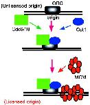 Establishment of licensing. The licensing process is accomplished by the step-wise assembly of initiator proteins on origin DNA. ORC is probably present on chromatin throughout a cell cycle and acts as a landing pad for Cdc6/18 and Cdt1, which load the MCM complex on to the chromatin, thus establishing licensing. It is not known how many MCMs are loaded at a single origin.