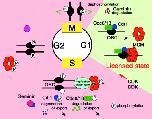 DNA replication licensing control during the cell cycle. The cell cycle is separated into two stages, a period with no or low CDK activity in G1 (represented by light green in the cycle) and a period with increased CDK activity from the onset of S-phase to the end of M-phase (represented by light pink). After the completion of mitosis, DNA is licensed for replication by loading of the MCM complex on to chromatin. This process is only allowed when CDK activity is at very low levels, normally at the end of M-phase. When the cells are committed to a new cell cycle, CDKs and a second protein kinase, DDK, are activated, leading to the initiation of DNA replication. DNA replication enzymes are recruited and the MCM complex, probably acting as a replicative helicase, moves on the chromatin as elongation proceeds, together with the replication machinery. At the same time, the origin is converted to an unlicensed state. CDK dependent phosphorylation of licensing factors prevents re-licensing by inhibiting their chromatin binding or by targeting them for proteolysis or nuclear export. In metazoa, Geminin, present from the onset of S phase to the end of M phase, binds to Cdt1 and prevents licensing. When DNA duplication and chromosome segregation have been faithfully completed, CDKs are inactivated and Geminin is degraded. Completion of mitosis allows the dephosphorylation of proteins and accumulation of loading factors, thereby permitting a new round of licensing.