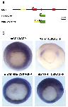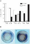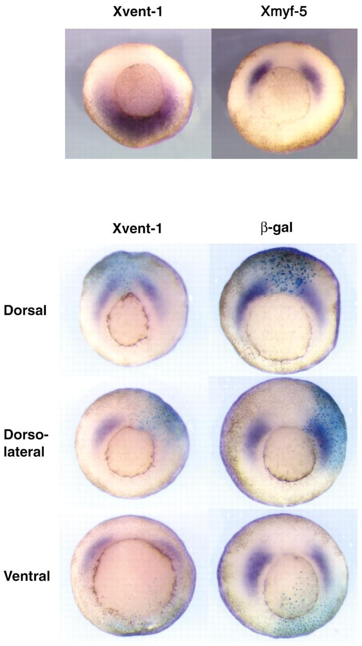 Fig. 7. (A) Endogenous expression of Xvent-1 and Xmyf-5. (B) The effect of Xvent-1 mis-expression on Xmyf-5. Single blastomeres of 4 cell stage embryos were injected with 250 pg Xvent-1 capped mRNA along with the lineage tracer β-gal (shown in blue). Xmyf-5 expression was then assayed at stage 10-11 by mRNA in situ hybridisation (purple). Embryos are orientated with dorsal pointing up and vegetal pole facing out.