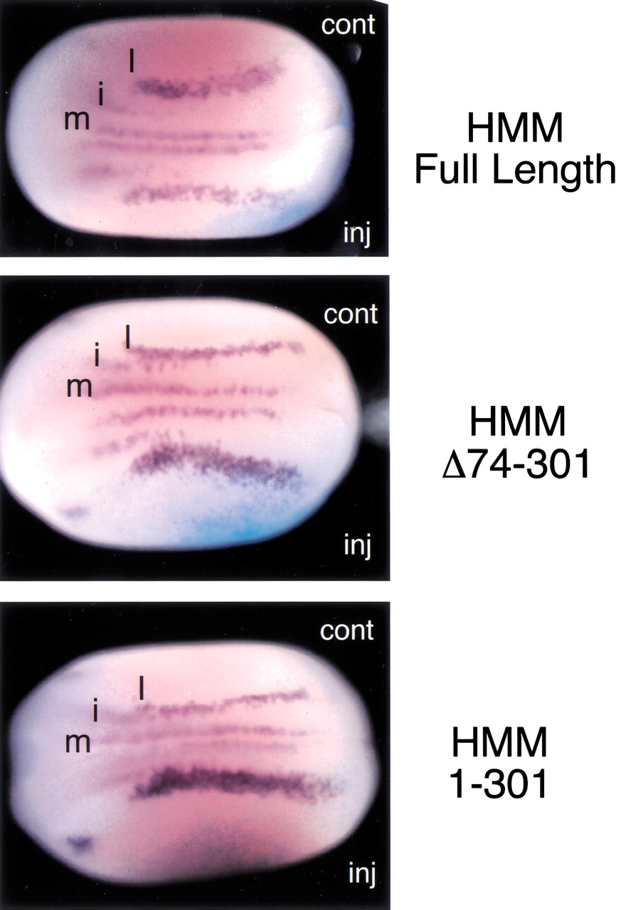 Figure 4. Both TAD1 and the C-terminal activation domain (TAD2) of MAM are required for Notch signaling in injected Xenopusembryos. Xenopus embryos at the two-cell stage were injected with RNA encoding wild-type (Full-length) or mutant human MAM proteins (HMMδ74â301; HMM1â301) along with lacZ RNA as a tracer. The embryos were fixed and stained for β-galactosidase expression and double-labeled by whole-mount in situ hybridization for a neural-specific tubulin. Notch signaling was assessed by counting the number of primary neurons on the neural plate for the half of the embryo that was injected (inj) relative to that for the uninjected control (cont). (m) Midline; (i) interneuron; (l) lateralneuron.