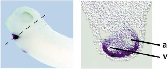 bves (blood vessel epicardial substance) gene expression in Xenopus laevis embryos, NF stage 33, as assayed by in situ hybridization. Lateral view: anteriorleft, dorsal up; also, transverse section of same at the plane of the heart