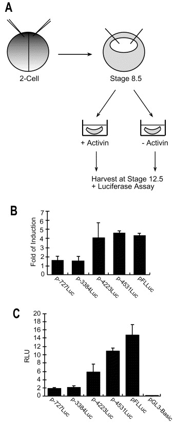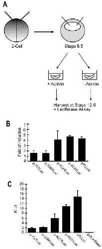 Fig. 4. Activin inducibility of Xmyf-5 reporter genes. (A) Experimental scheme. Twenty-five picograms of the various myf-5–luciferase reporter constructs were injected into the animal pole of 2-cell stage embryos. Animal caps were dissected from stage 8.5 embryos and treated either immediately with 50 ng/ml Activin for 1 h or cultured in 1× MBS. At stage 12.5, explants were lysed, and luciferase activities were measured. (B) Fold of induction of the indicated myf-5 reporter constructs by Activin. For each construct, RLU of Activin treated caps was divided by RLU of untreated caps after normalization to internal standard (see Section 4). (C) Luciferase activities of the various constructs injected into the dorsal marginal zone of both cells at stage 2. RLU, relative light units.