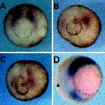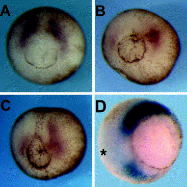 Fig. 7. Positive Wnt input into Xmyf-5 expression. One hundred picograms of Frzb mRNA or 50 pg Lef1-EnR mRNA were microinjected laterally into one blastomere of 2-cell stage embryos. Embryos were processed for whole mount in situ hybridization at stage 12 with antisense myf-5 (AâC) or at stage 11.5 for GFP (D) probes. All embryos are shown in vegetal views with the dorsal/anterior side pointing up. Uninjected control embryo shows the normal Xmyf-5 expression pattern (A). Xmyf-5 activity in the dorsalâlateral mesoderm was reduced where Frzb (B) or Lef1-EnR was injected (C). In δTcfGFP transgenic embryos, GFP expression was locally abolished at the site of Frzb-injection (D). The asterisk demarcates weak blue staining for nuclear galactosidase, whose RNA was co-injected as lineage tracer.