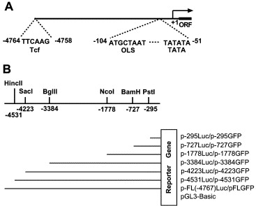Fig. 1. Molecular cloning of Xmyf-5 upstream DNA. (A) The isolated 4858 bp genomic DNA fragment contains upstream sequences, 5′ untranslated region and part of the open reading frame of the Xmyf-5 gene. The TATA box, OLS motif and a putative TCF binding site are indicated. The transcription initiation site is indicated by arrow. (B) Diagram of Xmyf-5 promoter deletion constructs used in luciferase assays and transgenic experiments.