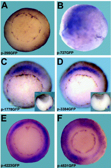 Fig. 3. Truncation analysis of the Xmyf-5 upstream region. Representative views of stage 11.5 transgenic embryos carrying the following transgenes: (A) p-295GFP, no significant signal was detected; (B) p-727GFP, subtle and non-specific GFP expression was extending throughout the animal hemisphere; (C,D) An arch-shaped expression pattern of GFP was present in both p-1778GFP and p-3384GFP transgenic embryos. Sections through the dorsal midline show that the positive signal is above the dorsal lip (inset). (E,F) GFP-positive signal extended ventrally and formed a ring surrounding the blastopore in p-4223GFP and p-4531GFP transgene embryos. All panels show vegetal views with dorsal side up, except (B) (lateral view, dorsal to the right).