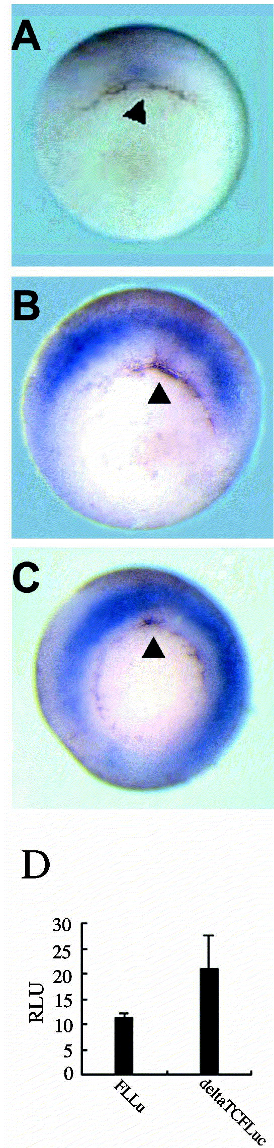Fig. 5. The distal TCF binding site mediates local repression of myf-5 transcription. (AâC) Representative transgenic embryos carrying the δTcfGFP construct during gastrulation (vegetal views, dorsal side up). GFP RNA was detected in the dorsal region at stage 10â (A); subsequently, the signal extended ventrally along the blastopore lip (B, stage 10.5), until it finally formed a full circle at stage 11.5 (C); arrowhead indicates blastopore lip pigmentation. (D) Luciferase assays of episomal reporter gene injections. Embryos were injected dorsolaterally at the 2-cell stage with 25 pg plasmids of pFLLuc or δTcfLuc, then harvested at stage 12.5 for measuring luciferase activities. RLU, relative light units, normalized to internal standard.