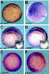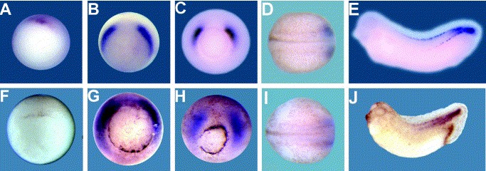Fig. 2. Time course of pFLCFP reporter gene expression in transgenic embryos. Transcripts of the endogenous Xmyf-5 or the GFP reporter gene were detected by whole mount in situ hybridization with Xmyf-5 or GFP antisense RNA probes, respectively. (AâE) Expression pattern of endogenous Xmyf-5 RNA at (A) stage 10â, (B) stage 11, (C) stage 11.5, (D) stage 19, (E) stage 31; (FâJ) expression of the pFLGFP transgene in pigmented embryos at the same stages. The expression pattern of GFP transgene was very similar to that of the endogenous myf-5, although a faint positive signal was detected above the dorsal lip in wide type embryos (A), but not in transgenic embryos at stage 10â (F). (AâC,FâH) Vegetal views of gastrulae with the dorsal side facing up; (D,I) dorsal views of neurulae; (E,J) lateral views of tadpoles. Neurulae and tadpoles: anterior to the left.