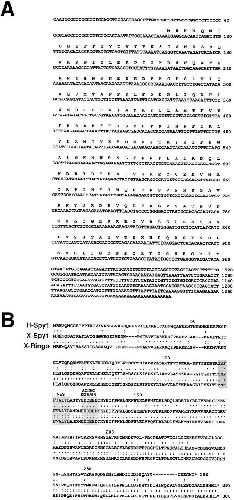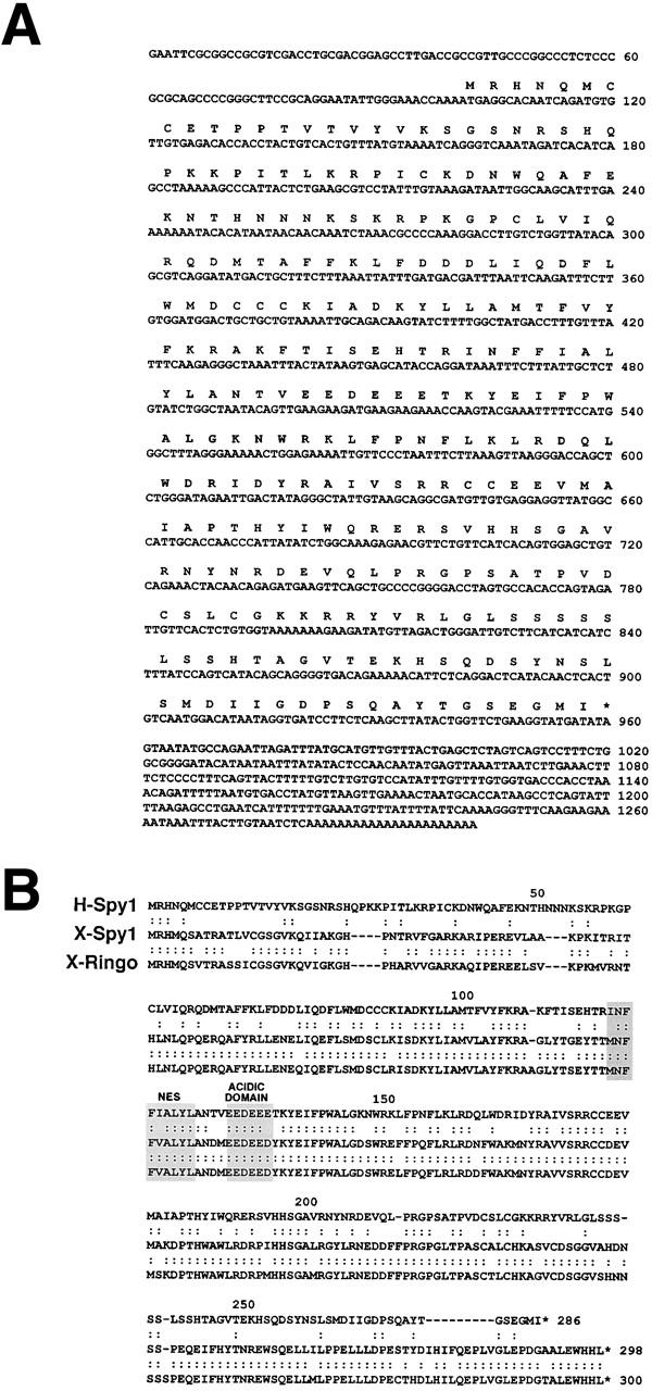 Figure 1. Identification of human Spy1. (A) Nucleotide sequence and predicted aa sequence of human Spy1. (B) The alignment of the amino acid sequence of Xenopus Speedy (X-Spy1) is shown in comparison with the human homologue (H-Spy1) and p33ringo (X-Ringo). A potential nuclear export signal sequence and a conserved acidic domain are shaded. The GenBank/EMBL/DDBJ accession no. for human Spy1 is pending.