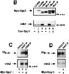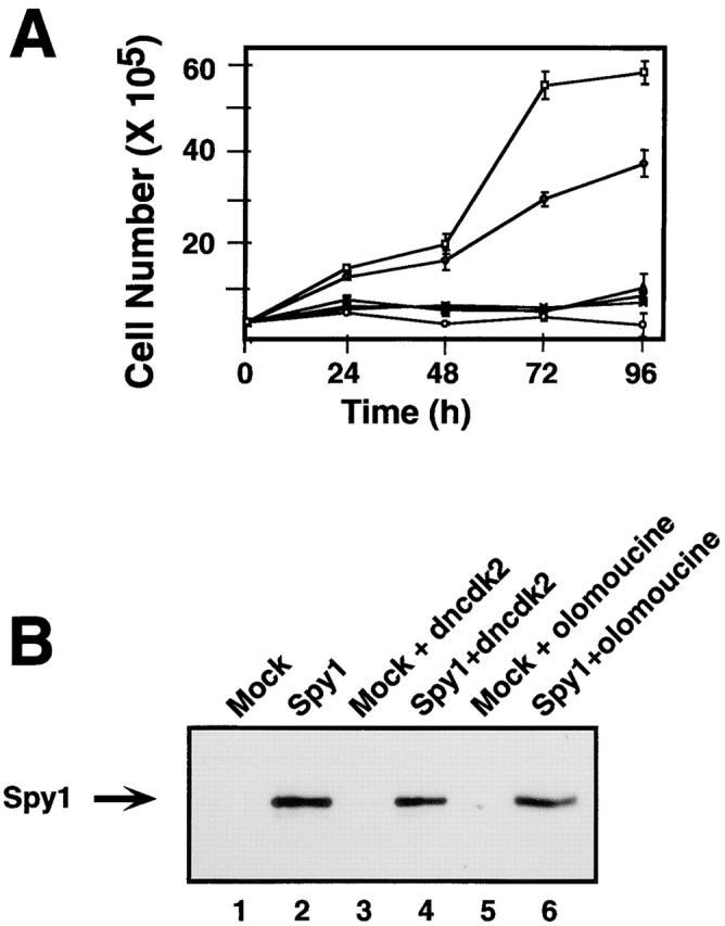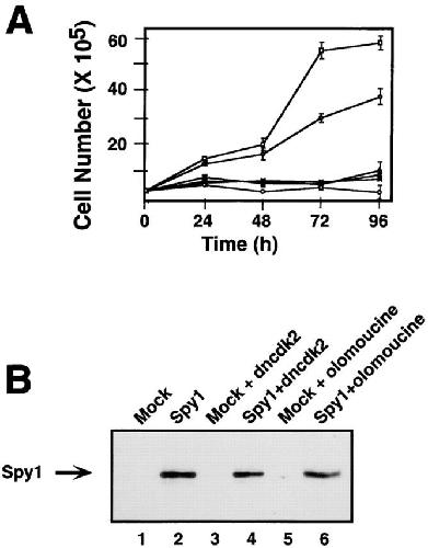 Figure 7. Spy1-enhanced growth is dependent on cdk2 activation. (A) Growth curve of 293T cells transiently transfected with Spy1 (□); mock (⋄); Spy1 + dncdk2 (cdk2D145N) (Δ); mock + dncdk2 (X); Spy1 + 7 μM olomoucine (∇); mock + 7 μM olomoucine (○). Error bars represent the SEM between triplicate plates of one representative experiment. This experiment was repeated three times. (B) Western blot of lysates from each sample at 96 h. The blot was then probed for myc–Spy1 expression.