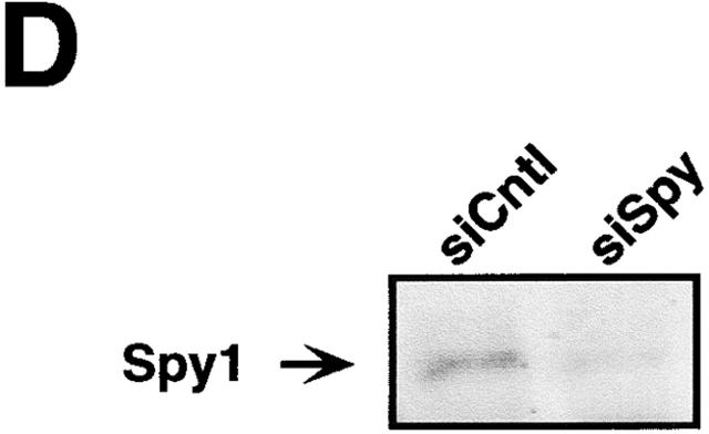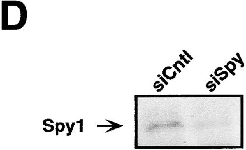 Figure 10. Depletion of Spy1 protein decreases cdk2-associated kinase activity and slows movement of cells into M phase of the cell cycle. (A) Mitotic index of cells expressing siSpy or siluc-GL2 (siCntl) 72 h after transfection. Error bars represent the average of three separate transfections. This is one representative experiment of three. (B) FACS® analysis of siSpy- and siCntl-expressing cells 72 h after transfection. Data were analyzed by M-cycle. One representative experiment of three is shown. (C) Cdk2-associated histone kinase activity was measured for cells transfected for 72 h with siSpy and siCntl. Data were quantitated using NIH Image 1.62. Similar alterations in kinase activity are observed over a range of time points. (D) Western blot control demonstrating that endogenous Spy1 protein is depleted 72 h after transfection of siSpy siRNA.