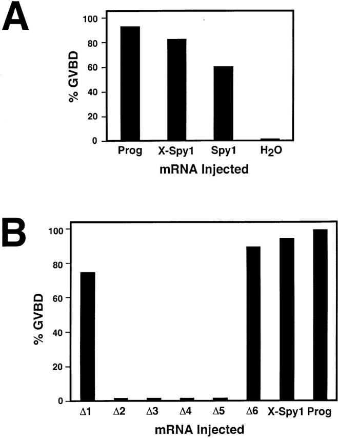 Figure 2. Human Spy1 induces GVBD in Xenopus oocytes. (A) Oocytes were injected with the indicated mRNA, incubated with progesterone (Prog) as a positive control, or injected with H2O as a negative control, and scored for GVBD by the formation of a white spot on the animal pole. This graph is the composite of three independent experiments. (B) Deletion mutants of Xenopus Spy1 define a minimal activation domain of X-Spy1. Oocytes were injected with the indicated mRNA or incubated with progesterone and scored for GVBD. Deletion mutants are missing the following aa: Δ1 (5–53), Δ2 (54–94), Δ3 (98–137), Δ4 (137–170), Δ5 (173–218), and Δ6 (218–268).