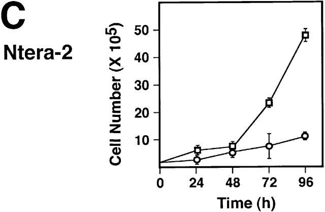Figure 5. Expression of Spy1 increases the rate of proliferation of mammalian cells. Growth curves of (A) HeLa cells, (B) NIH3T3 cells, and (C) Ntera-2 cells. All cells were transiently transfected with myc–Spy1 (□) or empty vector (○). Cells were collected in triplicate at the indicated time point and counted via trypan blue exclusion. The graph is one representative experiment of at least three independent experiments. Error bars were calculated using SEM.