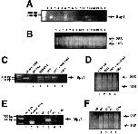 Figure 3. Human Spy1 mRNA is present in a variety of human tissues and immortalized cell lines. (A) RT-PCR of mRNA from 15 different human tissues. Lane 1 is a negative RT-PCR control containing no mRNA. Lane 2 is a positive RT-PCR control using control RNA with control primers. Human tissue samples are as follows: lane 3, thymus; 4, salivary gland; 5, liver; 6, fetal brain; 7, adrenal gland; 8, bone marrow; 9, fetal liver; 10, lung; 11, skeletal muscle; 12, thyroid; 13, brain/cerebellum; 14, heart; 15, placenta; 16, spleen; 17, trachea. (B) Control formaldehyde gel demonstrating the quality and quantity of the mRNA used in A. (C) RT-PCR of mRNA prepared from Ntera-2 cells (lane 3), 293T cells (lane 4), Spy1-transfected 293T cells (lane 5), and HeLa cells (lane 6). Lanes 1 and 2 are RT-PCR controls with a control mRNA and no mRNA, respectively. (D) Control formaldehyde gel demonstrating the quality and quantity of the mRNA used in C. Lanes 1–4 correspond to lanes 3–6 in C. (E) RT-PCR of mRNA prepared from synchronized 293T cells at various stages of the cell cycle. Lanes 1 and 2 are RT-PCR controls with no mRNA and control mRNA, respectively. (F) Control formaldehyde gel demonstrating the quantity and quality of the mRNA used in E. Lanes 1–5 correspond to lanes 3–7 in E.