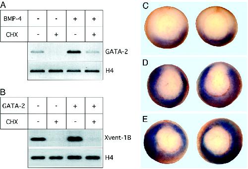 of GATA-2 RNA (D) or with 250 pg of Xvent-2 RNA (E). Embryos are