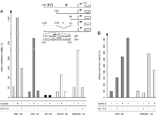 deletions or mutations of this fragment (see inset; marks the GATA-2 and # the Xvent-2 binding sites; the arrow denotes a GATA-2 target
