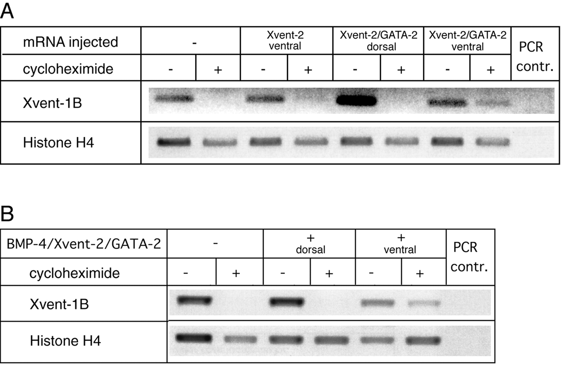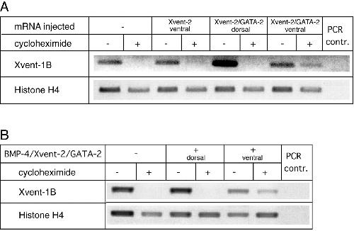 GATA-2 (A) or Xvent-1B (B) transcripts. Histone H4 transcripts were