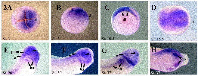 Fig. 2. xCAP1 expression during embryogenesis. Maternal xCAP1 transcript becomes localized to the animal pole during the early stages of cleavage (A), and progressively concentrates on the presumptive dorsal (d) side (A,B). As the ectoderm thickens, surface ectoderm down-regulates xCAP1 at the extreme animal pole, while expression ensues in sensorial ectoderm, marginal zone and dorsal mesoderm during gastrulation, so that cells immediately above and passing through the dorsal lip (dl) express (C). Late in gastrulation, presumptive neurectoderm is devoid of xCAP1 expression anteriorly (not shown), but by mid neurulation, the gene expresses in neurectoderm up until the neural folds have sutured. Both layers of dorsal ectoderm express during neurulation, as well as dorsal mesoderm and neurectoderm. Dorsal expression extends in a comparable pattern from the yolk plug to the anterior end (a), but is absent from endoderm from neural plate (stage 12) through to neural tube suturing (in this dorsal view of a stage 15.5 embryo)(D). During elaboration of the head, xCAP1 is expressed in the branchial arches (ba), otic vesicle (o), lens (l), and peri-optic mesenchyme (pom) (E,F). Branchial arch expression is predominantly mesenchymal. By stages 36â37, olfactory placodes (op) and pronephric structures (pn) express transcript (G,H).