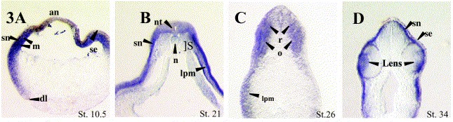 Fig. 3. xCAP1 expression revealed in section. Animal pole (an) and surface ectoderm (se) do not express xCAP1 during gastrulation, though both mesoderm (m) and sensorial ectoderm (sn) do (A). Cells passing through the dorsal lip (dl) appear to temporarily down-regulate xCAP1 indicating that expression patterns of this transcript can be rapidly altered. By late neurulation (B), both layers of ectoderm express transcript, but expression in surface ectoderm begins to diminish, while sensorial ectoderm (sn) and, to a lesser extent lateral plate mesoderm (lpm) continue to express. Neither notochord (n) nor somites (s) express xCAP1, however, a low level of expression can be seen in the lateralventral aspect of the neural tube (nt). During tail bud stages (C), transcript is detectable in the ventralrhombencephalon (r), the otic vesicle (o), and the lateral plate mesoderm (lpm), and expression in surface ectoderm has down-regulated. When eye begins to form, xCAP1 expression is detectable in the lens, particularly at the margins (D). By this stage xCAP1 expression is entirely lacking in the surface ectoderm.