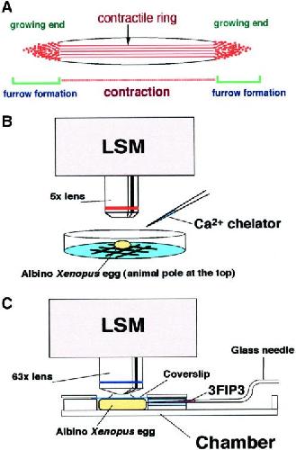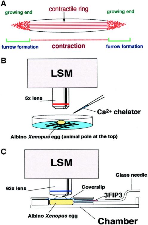 Fig. 1. Calcium imaging systems. (A) Schematic representation of the cleavage furrow and the F-actin structures. The two growing ends are the sites where the contractile ring structure is continuously formed. However, the middle region is where contraction occurs. It has been shown that rhodamine-WGA staining colocalizes with F-actin staining at the growing end of the cleavage furrow. SeeNoguchi and Mabuchi (2001) for detail. (B) Imaging of Ca waves was carried out using LSM at low magnification. Albino eggs were observed from the animal hemisphere to monitor the early cleavage furrow. Ca chelators were injected from the side during imaging. (C) Imaging of Ca puffs and Ca blips was carried out in a handmade chamber for scanning at high magnification using the LSM. In the chamber, the egg was compressed by a coverslip in order to flatten the cortex. The chamber has a slit at one side to introduce the glass needle for microinjection.