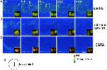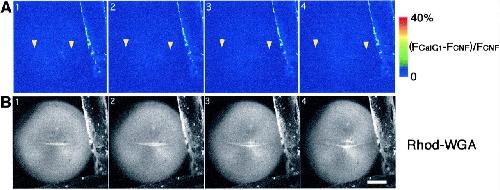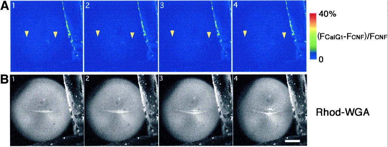 Fig. 2. Dual time-lapse imaging of [Ca2+]i and the newly emerging cleavage furrow. (A) Time-lapse images at an interval of 90 s depict increasing fluorescence intensity of CalG-dx (increasing free [Ca2+]i: (FCalGâ FCNF)/FCNF Ã 2.5) on a pseudocolor scale as indicated by the color bar. The positions of the growing ends in B are indicated with yellow arrowheads. Note that no obvious elevation of the free [Ca2+]i was detected at the growing end of the cleavage furrow. (B) Serial images of a newly emerging and elongating cleav-age furrow stained with rhodamine-WGA (the white line in the middle of the egg). Each image was simultaneously obtained with those shown in A. Scale bar, 0.2 mm.