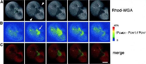 Fig. 5. Dual imaging of rhodamine-WGA staining and Ca wave 1. (A) A time-lapse recording of rhodamine-WGA staining of the egg surface during furrow deepening at 2-min intervals. The region where the membrane is newly inserted appears as a dark region (the area encircled by a dotted line). The arrowheads indicate the division plane. (B) Pseudocolored images of increased free [Ca2+]i; (FCalG â FCNF)/FCNF Ã 2.5, simultaneously obtained with the images in a, demonstrating that Ca wave 1 propagates in the furrow region. Duration of Ca wave 1 is significantly shorter than that of cytokinesis. It is excluded from the contractile ring area (arrow). (C) Merged images of (A, red) and (B, green). Wave 1 is restricted to the area of newly inserted membrane. Scale bar, 0.2 mm.