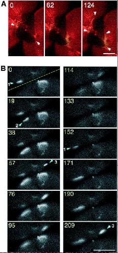 Fig. 6. Ca wave 2 propagates along the border of old and new membranes after completion of cytokinesis. (A) Representative merged image of rhodamine-WGA staining (red) and increasing free [Ca2+]i: (FCalG â FCNF) Ã 2 (green) during Ca wave 2 after completion of the first cleavage. Wave 2 emerged at the animal pole and traversed along the border of old and new membranes. Arrowheads in the image at 0 s indicate the starting point of wave 2, and those in the image at 124 s indicate the wave front. Note that the egg had already divided into two blastomeres before wave 2 first appeared. (B) Gray scale images of increased free [Ca2+]i; (FCalG â FRhod) during a typical wave 2. The yellow line in âtime 0â indicates the position of the division plane. Wave 2 does not propagate continuously, but often skips a distance of several hundred micrometers, reappearing along the border of the two membranes or flickering at some particular site several times. Arrowheads indicate initiation sites of wave 2. At site 1, Ca signal is flickering (the signal is seen during 0â95 s, disappears and then reappears after 152 s). There seemed to be no synchrony between the waves in the two blastomeres. Numbers indicate the recording time (seconds). Scale bars, 0.2 mm.