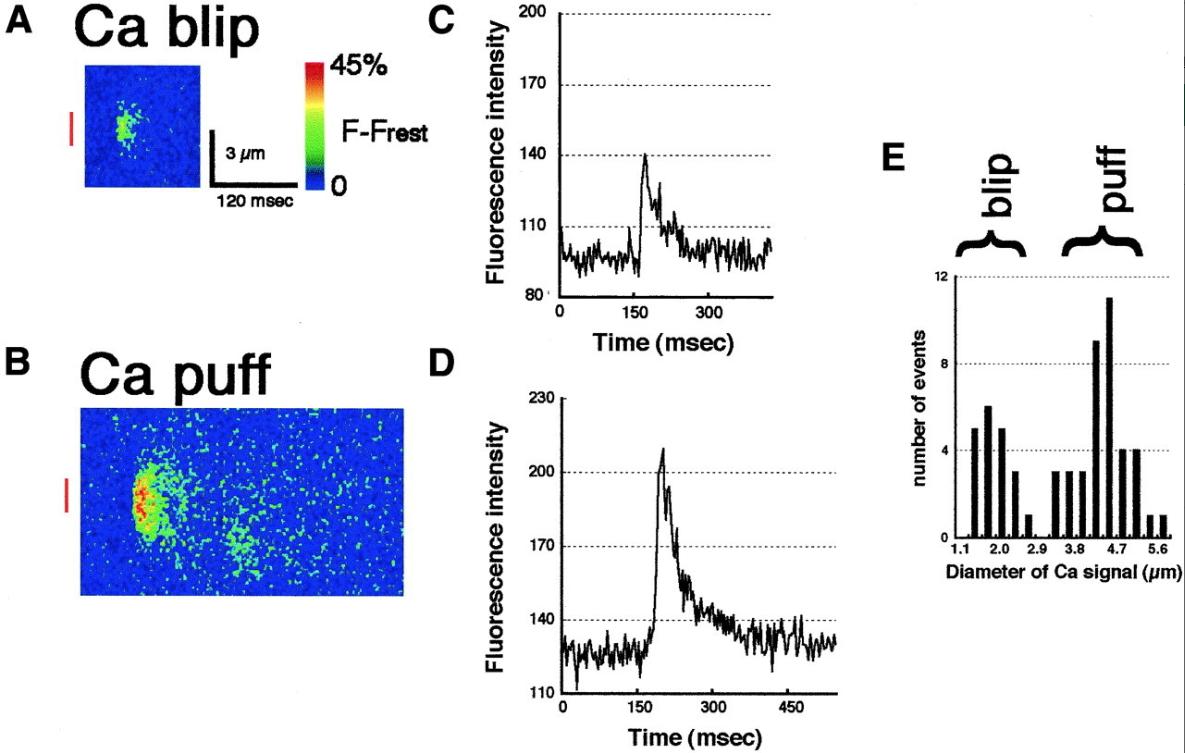 Fig. 3. Line-scan images of Ca blips and puffs that were induced by the injection of 3FIP3 detected in the animal hemisphere. (A and B) Pseudocolor representations of local increase of free [Ca2+]i at a single Ca blip (A) and puff (B) recorded by confocal line-scanning. The changes of fluorescence intensity every 3 ms on a line at a fixed position is depicted. The abscissa represents the time and ordinate represents scale (μm). The traces in C and D show the fluorescence intensities monitored across the area indicated by red bars in A and B, respectively. Note that the signal in A is well distinguished from the background noise. Diameters, durations, and total signal masses are significantly different between Ca blips and Ca puffs. (E) A histogram showing the size distribution of Ca signal events. The half-maximal diameters of 59 Ca signals obtained from 8 eggs were measured. There are two groups of signals observed with different half-maximal diameters. The averages of the half-maximal diameters are 1.8 ± 0.45 μm in the left group (Ca blips) and 4.3 ± 0.65 μm in the right group (Ca puffs).