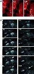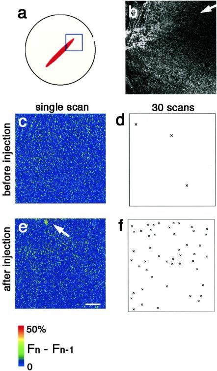 Fig. 4. Neither Ca puffs nor Ca blips appear at the growing end of the cleavage furrow. (a) An egg at an early stage of cytokinesis was labeled with rhodamine-WGA to mark the cleavage furrow, and [Ca2+]i was monitored using Fluo-4. The area indicated by the square in a was scanned for the Fluo-4 fluorescence. Thirty frames were obtained at the speed of 0.78 s/frame. This scan speed is equal to that of the line-scan in Figure 3. After this data collection, 3FIP3 was injected near the scan area. Again 30 frames of scan images were obtained at the same speed in the same area. (b) Rhodamine-WGA staining of the growing end of the cleavage furrow shown in a. The white arrow indicates the position of the growing end of the cleavage furrow. (c and e) Representative single confocal frame scan images, showing increased free [Ca2+]i: (Fn â Fnâ1) à 2 in a pseudocolor scale before (c) and after (e) 3FIP3 injection in the area shown in a. The arrow indicates a Ca blip detected after 3FIP3 injection. (d and f) Patterns of subcortical Ca release before (d) and after (f) 3FIP3 injection. The total Ca signals and their position identified in all 30 frame scans, in the same field shown in a, c, and e are marked (Ã). Ca signals are clearly distinguishable from noise based on their signal mass and diameters (>1.5 μm). Only three signals are detected around the growing end of the cleavage furrow before 3FIP3 injection, whereas 48 Ca microspikes including both Ca blips and Ca puffs were detected in the respective 30-frame scans after injection. Scale bar, 25 μm.