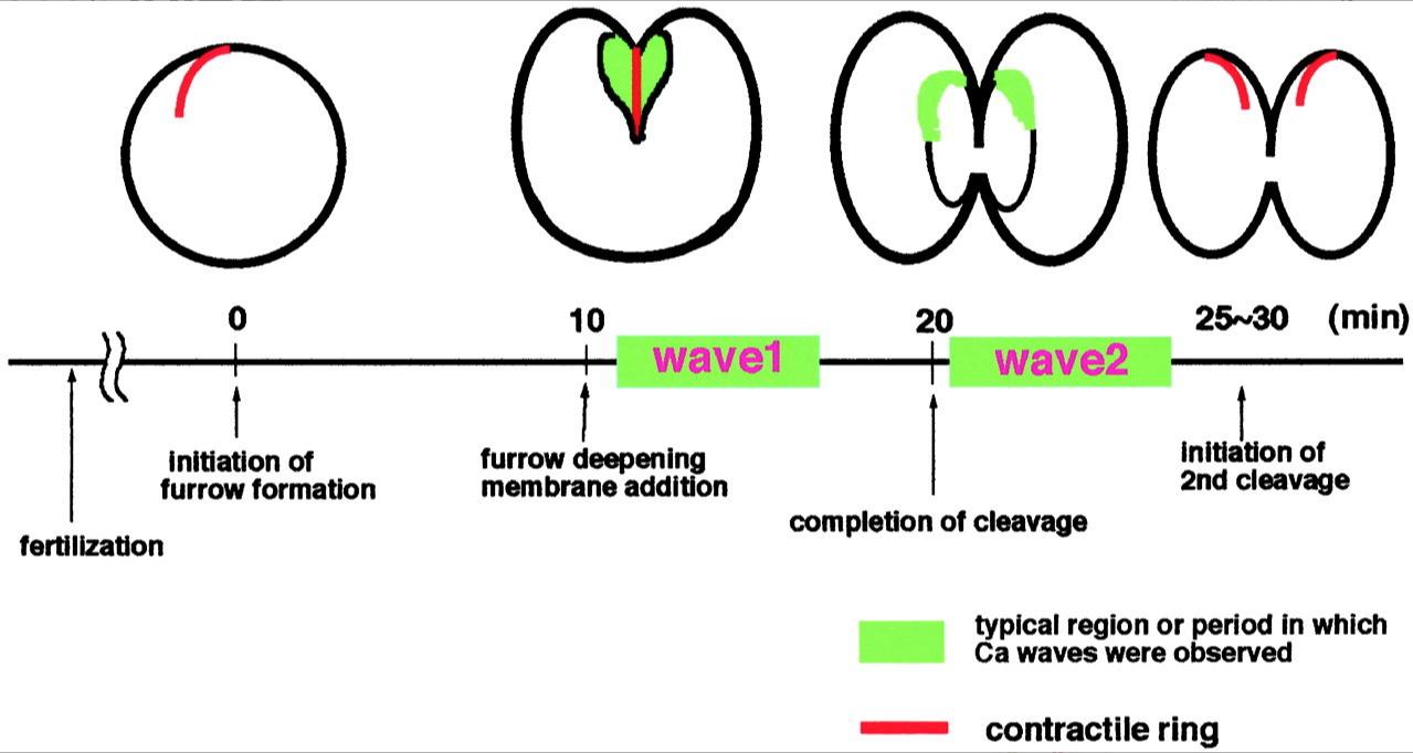 Fig. 7. Schematic drawings of Ca waves along the cleavage furrow during first cleavage.