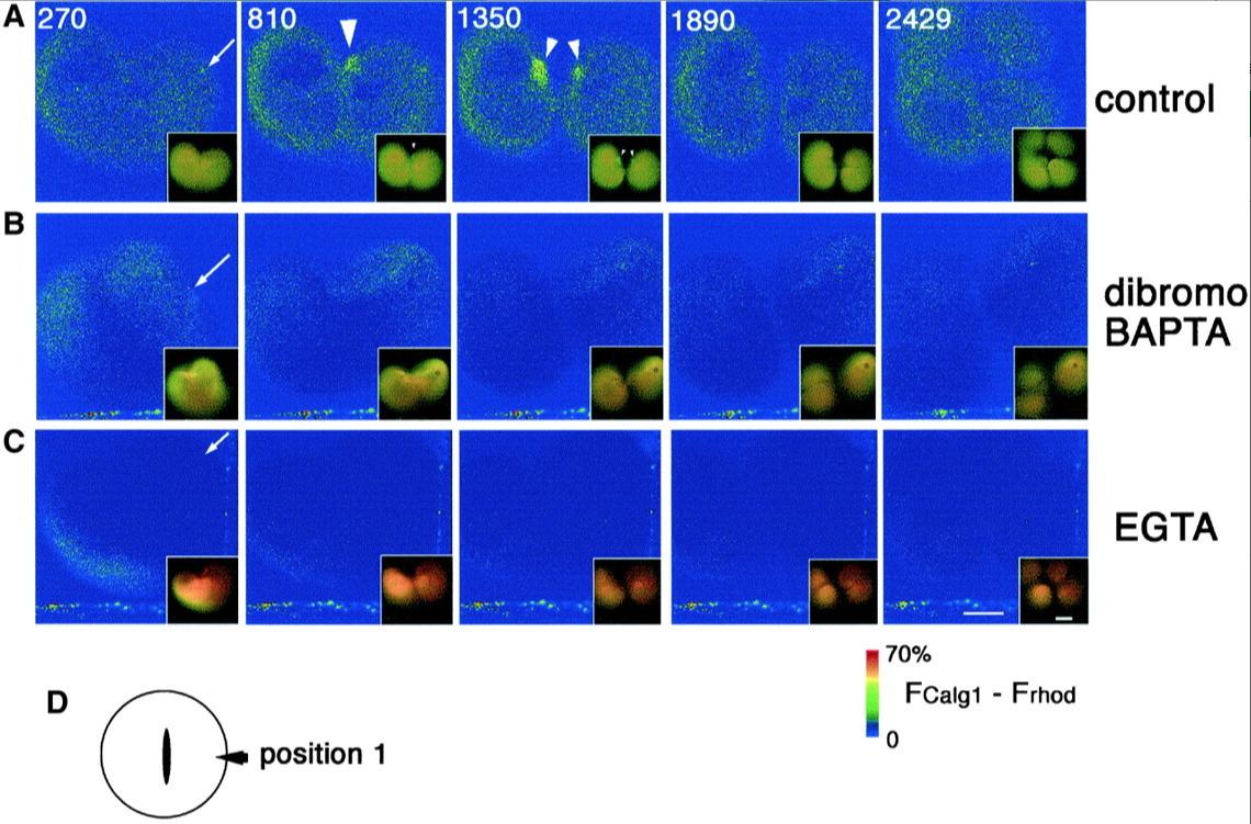 Fig. 8. dibromoBAPTA or EGTA effectively suppresses both Ca wave 1 and 2 without affecting cytokinesis. Pseudocolored time-lapse images showing the change of free [Ca2+]i after Ca chelator injections. Four nanoliters each of the injection buffer alone as control (A), 0.9 mM (final concentration in the cytosol) dibromoBAPTA (B), or 0.9 mM (final concentration) EGTA (C), were injected into dividing eggs during early furrowing at a polar region (D and arrows in AâC), and the effects on both cytokinesis and free [Ca2+]i;(FCalG â FRhod) Ã 1.4, were monitored. The merged raw data for CalG-dx and Rhod-dx are also presented in the right bottom of each pseudocolor image to show the appearance of the embryos. Yellow color represents the resting level of the [Ca2+]i. As the [Ca2+]i was lowered by Ca chelators, the color turned to reddish. The numbers in A indicate times (seconds) after injection. Images in B and C were obtained at the same time points. (A) In the control egg, Ca wave 1 and 2 were detected at 810 s and 1350 s, respectively (arrowheads). (B) Injection of dibromoBAPTA did not alter the free [Ca2+]i significantly as expected from itsKd for Ca ion. In the dibromoBAPTA-injected egg, both wave 1 and wave 2 were suppressed but the first cleavage was not affected or only slightly delayed. The second cleavage of the blastomere on the injection side was inhibited. Deformation occurred frequently around the site of the injection (inset of the picture of 270 s). (C) The injection of EGTA lowered the [Ca2+]i immediately and significantly. Both Ca wave 1 and wave 2 were suppressed. However, the first and second cleavages occurred normally. (D) Position of injection site. Position 1, position away from both ends of the cleavage furrow. Scale bars, 0.2 mm.