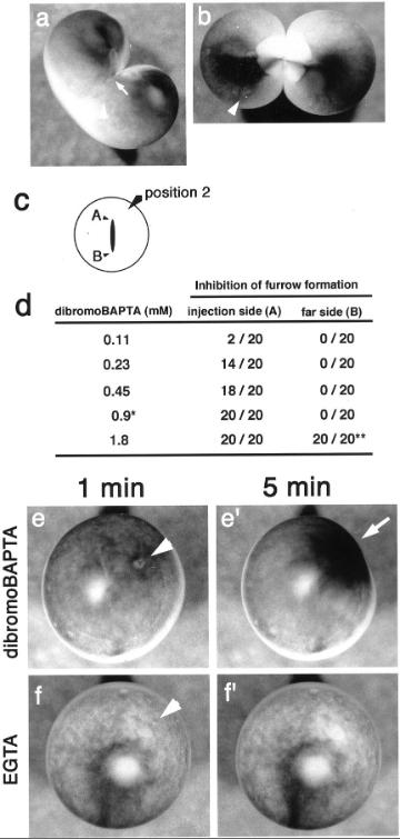 Fig. 9. Effect of dibromoBAPTA and EGTA on the cortex of Xenopus eggs. (a and b) Thirty minutes after the injection of 0.45 mM dibromoBAPTA (a) or injection buffer (b) into dividing wild-type Xenopus egg. Arrowheads, injection sites; white arrow, the position of the growing end. (a) Furrow formation was clearly inhibited on the side of the injection. The growing end was drawn back to the center of the egg after its progression had stopped. On the other hand, the furrow progressed normally at the other end. In the control egg (b), both ends grew and the egg cleaved normally. (c) Positions of injection sites. Position 2, injection carried out at a position near the growing end of the cleavage furrow. (d) Dose-dependent inhibition of furrow formation by dibromoBAPTA. Progression of the furrow at the growing ends (A or B) was examined 30 min after injection. â, concentration (0.9 mM) used in Ca monitoring experiment in Figure 8. ââ, at 1.8 mM, progression of the furrow at the end B was very slow, and the egg was severely deformed. Ca buffers were injected into fertilized wild-typeXenopus eggs, and changes of the cortex were monitored 1 min (e and f) and 5 min (eâ² and fâ²) after the injections. Arrowheads in (e) and (f) indicate the positions of injection site. Injection of 1.8 mM dibromoBAPTA (eâ²), induced deformation of cortex and concentration of pigment granules around the injection site (arrow). (f and fâ²) Injection of 6.3 mM EGTA did not cause such contraction in the cortex.