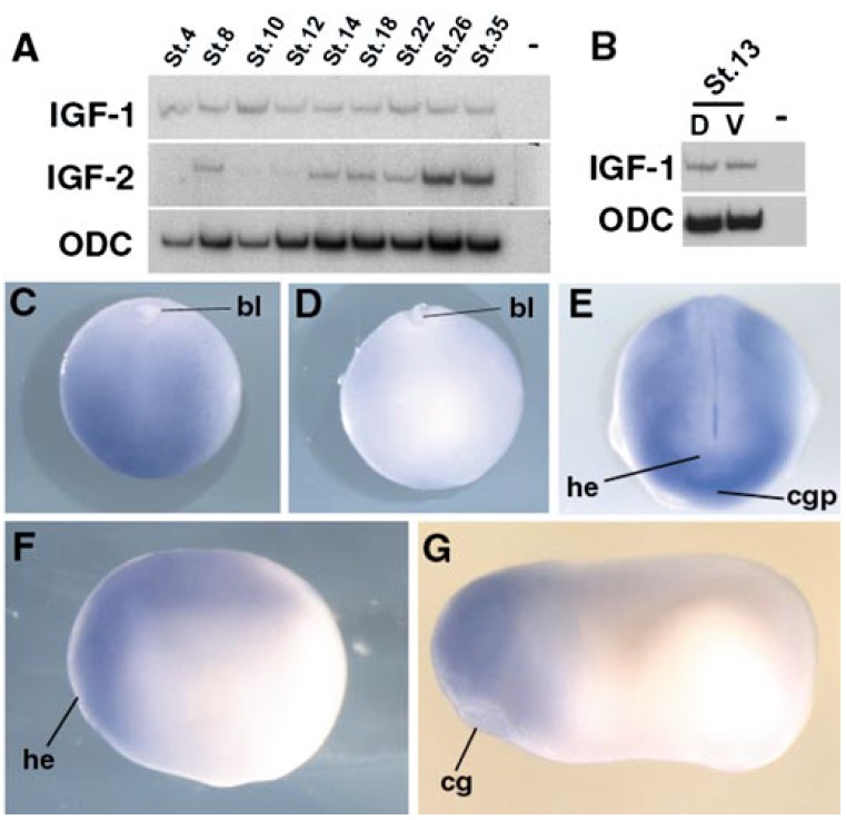 FIG. 1. Expression of IGF signaling components during Xenopus development. (A) RT-PCR analysis of IGF-1 and IGF-2 transcripts throughout development. (B) RT-PCR analysis of IGF-1 expression at early neurula stage (D, dorsal; V, ventral side of the embryo). (CâG) IGF-1R mRNAs detected by in situ hybridization (bl, blastopore; he, head; cgp, cement gland primordium; cg, cement gland). Expression is first detected at the end of the gastrulation (stage 12) in the presumptive dorsal side of the embryo (C) but excluded from the ventral part of the embryo (D). During neurulation, transcripts are present in the head region and in the anteriormesoderm, but are not detectable in the neural tube and the ventral part of the embryo (E, frontal view; F, lateral view). At tailbud stage, transcripts are present in the head and the anterior part of the neural tube (G).