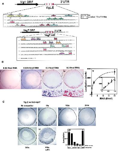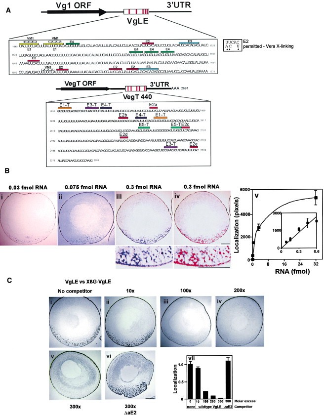 Figure 1. Development of a Localization Assay that Quantitatively Measures RNP Formation and Accumulation in the Wedge(A) Repeated sequence elements within the VgLE and VegT440. As noted previously [12], within the VgLE there are two copies of E1 (UAUUUCUAC, yellow), five copies of E2 (UUCAC, red) (one is imperfectâUUGCAC), two copies of E3 (UGCACAGAG, turquoise), and four copies of E4 (CUGUUA, green). Two of the three copies of VM1 [13] (UUUCUA, hatched) are embedded within the E1 repeats. Small diagram to the right: single E2 nucleotide substitutions that had little effect on Vera crosslinking to a tandem E2 probe [1] are indicated as permitted substitutions. A 440 nt subregion of the VegT 3â²UTR contains four perfect E2s (UUCAC) and a single imperfect E2 (UUGCAC). Other repeated elements, distinct from the repeats in VgLE, are also evident within VegT440: two copies of E1-T (GUGGUGGU), two copies of E3-T (CUAACUCU), two copies of E4-T (CAUUUUC), and two copies of E5-T (UGUGUG).(B) Quantification of RNA localization. Stage IIIâIV oocytes were injected with increasing amounts of XβG-VgLE RNA (0.003â32 fmol) and processed as described in the Supplementary Material. (BiâBiii) Representative pictures from one group of oocytes injected with increasing amounts of wild-type XβG-VgLE RNA. The pigmented animal poles are oriented upwards. To quantify RNA localization, we computedâfrom single midsagittal sections of injected oocytesâthe summed areas occupied by each of the labeled RNA particles or subregions (Biv). To (continued from previous page)select those pixels that contain the dark blue alkaline phosphatase reaction product, we transformed each image with a threshold function (pixels selected by this transformation are color-coded red in [Biv], which is the threshold image of [Biii]). The graph shows that the summed areas of pixels occupied by RNA particles increases and then saturates with the amount of RNA injected; the approximate half-maximum saturation point is 11 fmol of RNA (concentration in oocyte, 55 nM) (Bv). Over a range of injected RNA (<0.6 fmol), the area of oocyte sections occupied by RNA particles scales linearly with the amount of injected RNA (graph inset).(C) In vivo competition assay of VgLE RNA localization. Wild-type VgLE RNA competes the localization of XβG-VgLE RNA. XβG-VgLE RNA was coinjected with 10, 100, 200, or 300 molar excess of VgLE RNA (CiâCv). Competition with mutant VgLE lacking all five E2s (δaE2), even at 300-fold molar excess, did not affect localization of XβG-VgLE (Cvi). Quantification of localization (Cvii). n = 6, number of oocytes; error bars in this and other graphs are SEM. Scale bars, 100 μm.
